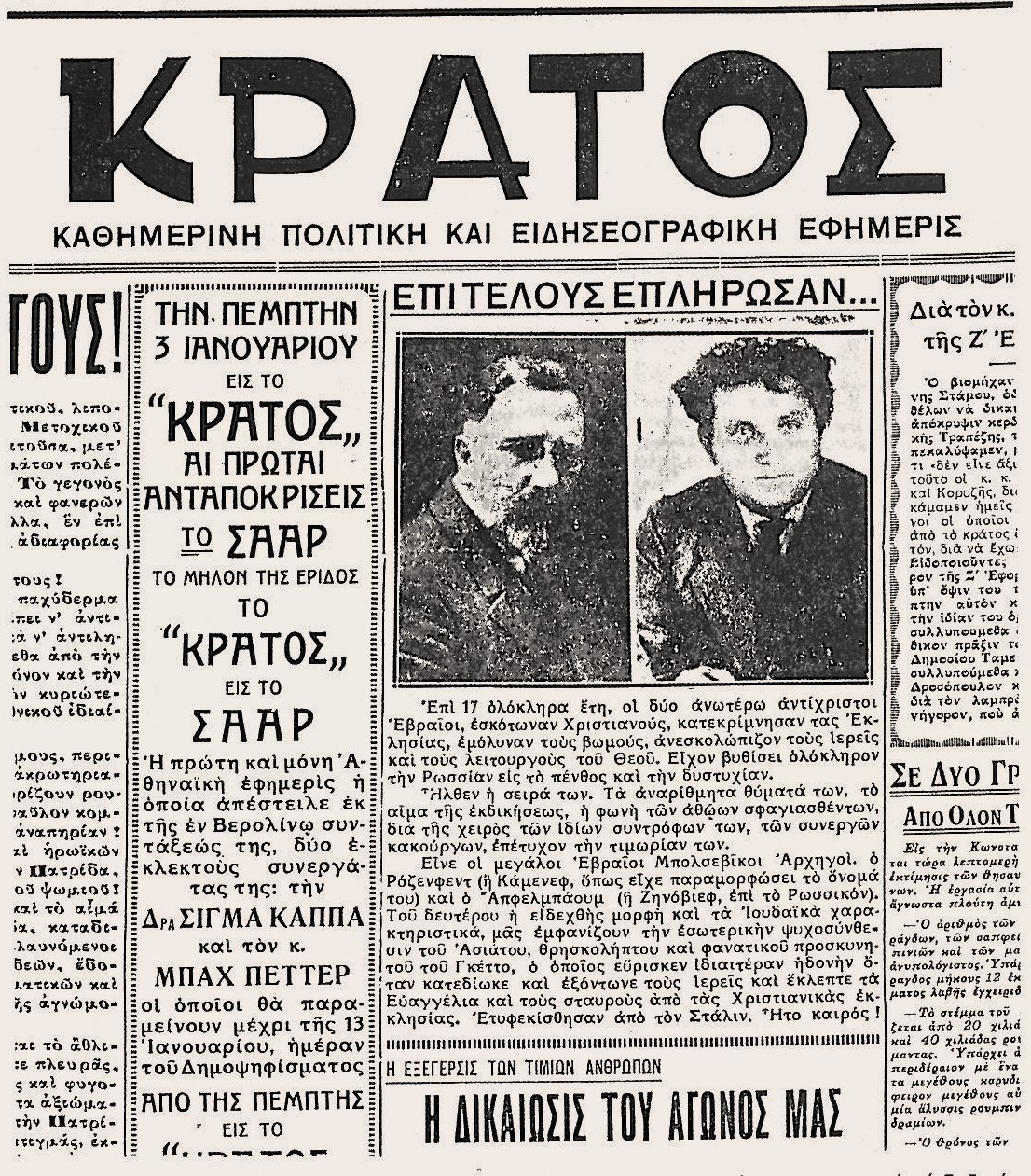 Πραγματικά, στις 2 Απριλίου 1927 τοιχοκολλήθηκαν σε πολλά σημεία της συμπρωτεύουσας προκηρύξεις με τίτλο «Οι Εβραίοι και ο Κομμουνισμός». Περιείχαν κατηγορίες για συνωμοσία της Μόσχας με όργανα τους Εβραίους της Θεσσαλονίκης και προτροπές για εκδίωξη της μειονότητας από την Ελλάδα. Η ισραηλιτική κοινότητα διαμαρτυρήθηκε τότε έντονα στον γενικό διοικητή, όπως άλλωστε έπραξε και ο γενικός γραμματέας του Εργατικού Κέντρου Θεσσαλονίκης, I. Αρβανιτάκης. Ο Ισραηλίτης μάλιστα βουλευτής Ζακ Βεντούρα έφερε το θέμα στη Βουλή στις 4/4/1927, όπου με την ευκαιρία ζήτησε να ληφθούν μέτρα κατά της δραστηριότητας των αντιεβραϊκών στοιχείων (βλ. εφημερίδες «Μακεδονία» 3/4/1927, «Ριζοσπάστης» 13/4/1927, «Εφημερίδα των Βαλκανίων» 4/4/1927 και το βιβλίο «Ο χαφιές» του Αλέξ. Δάγκα).