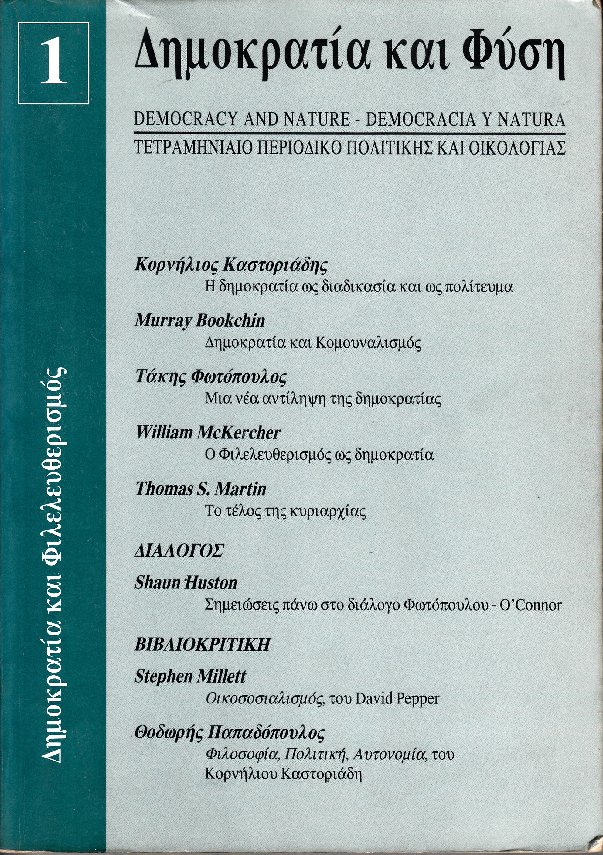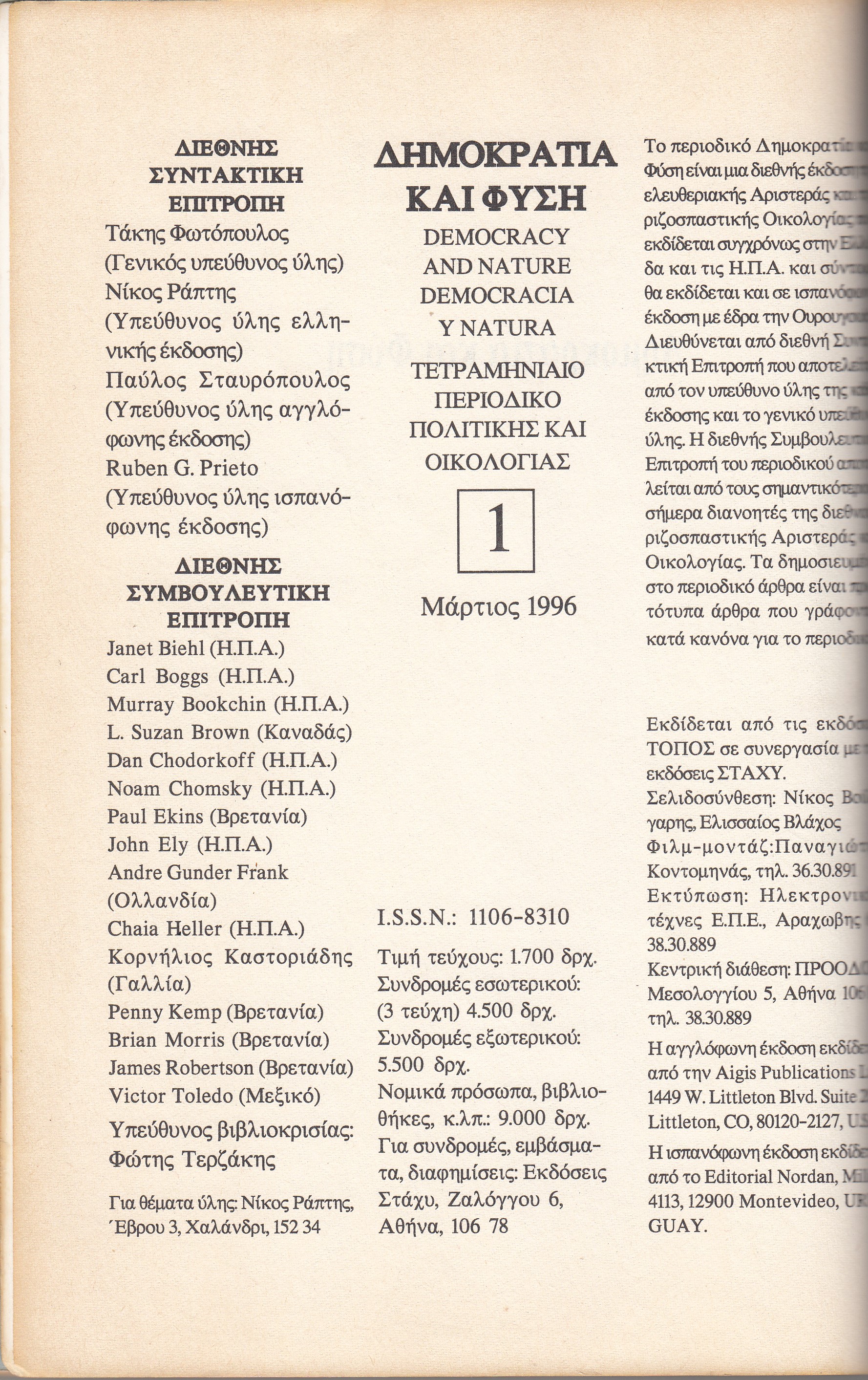 Πρώτη έντυπη δημοσίευση στην Ελλάδα, περιοδικό «Δημοκρατία και Φύση» τεύχος 1, Μάρτιος 1996, [#] (δείτε στο τέλος της δημοσίευσης )