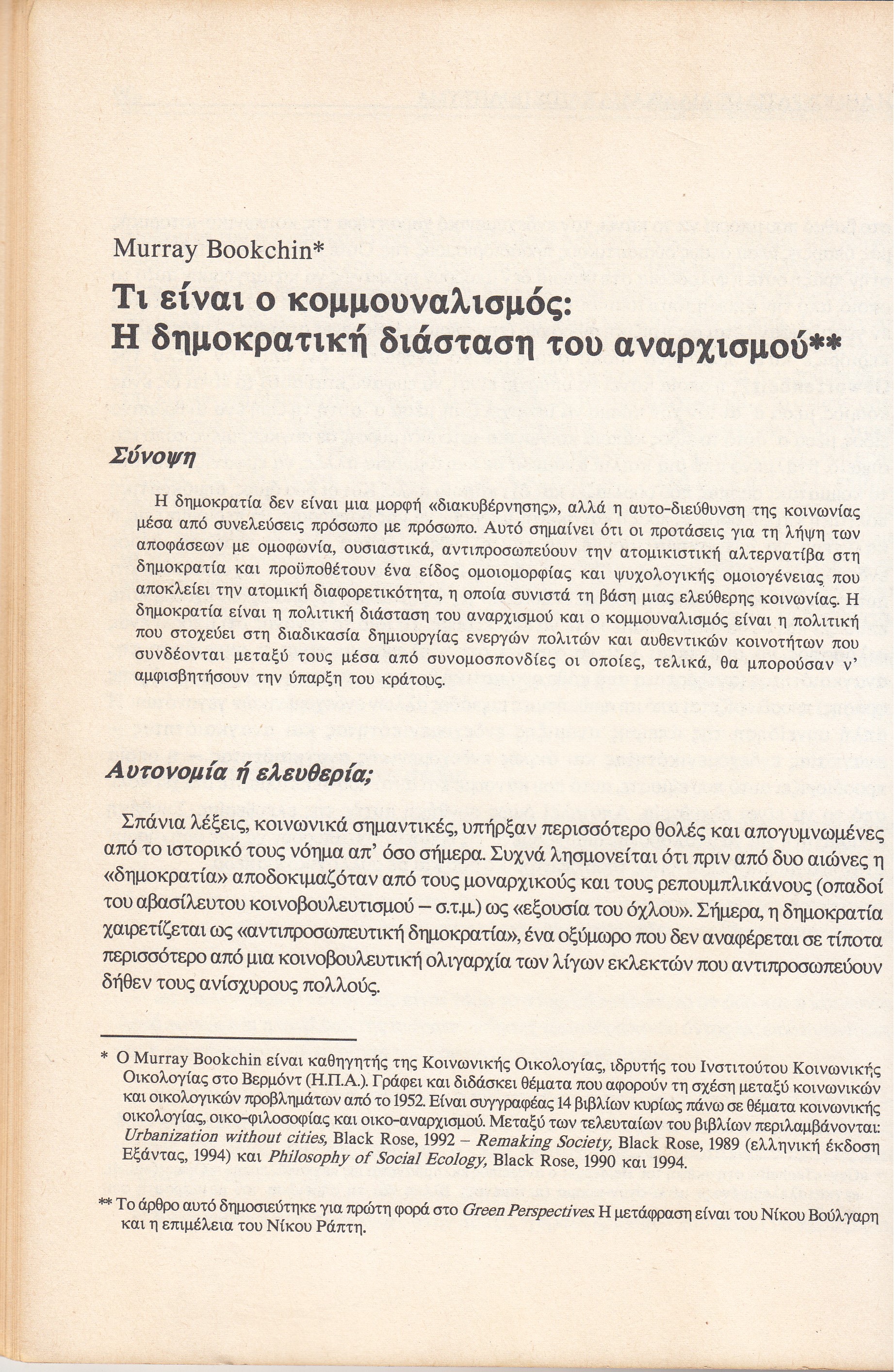 Θα ήθελα να προτείνω ότι η δημοκρατική και δυνάμει πρακτική διάσταση του ελευθεριακού σκοπού θα μπορούσε να βρει έκφραση στον όρο «Κομμουναλισμός» (Communalism), ο οποίος, σε αντίθεση με πολιτικούς όρους που κάποτε υποστήριζαν σαφώς μια ριζοσπαστική κοινωνική αλλαγή, δεν έχει κηλιδωθεί ιστορικά. Ακόμα και ορισμοί του Κομμουναλισμού σε συμβατικά λεξικά συλλαμβάνουν σε μεγάλο βαθμό το όραμα για μια «Κομμούνα των κομμούνων», που έχει χαθεί από τις σύγχρονες άγγλο-αμερικανικές τάσεις, που εξυμνούν την αναρχία ως «χάος», ως μυστικιστική «ενότητα» με τη «φύση», ως αυτο-ολοκλήρωση, ως «έκσταση», μα πάνω από όλα ως προσωπική. [7]