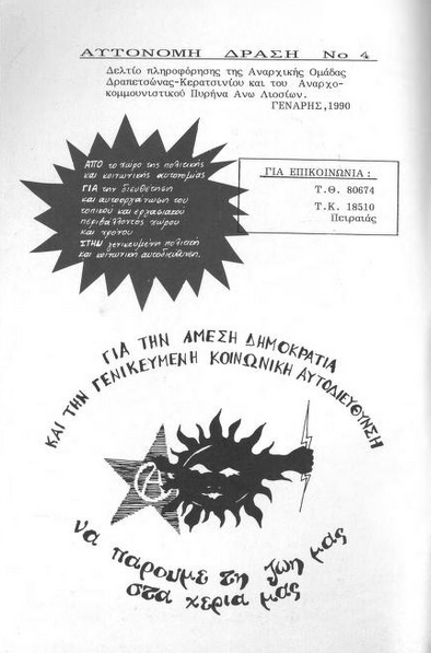 Αυτόνομη Δράση νο4: Δελτίο πληροφόρησης της Αναρχικής ομάδας Δραπετσώνας-Κερατσινίου και του Αναρχοκομμουνιστικού πυρήνα Άνω Λιοσίων, Γενάρης 1990.