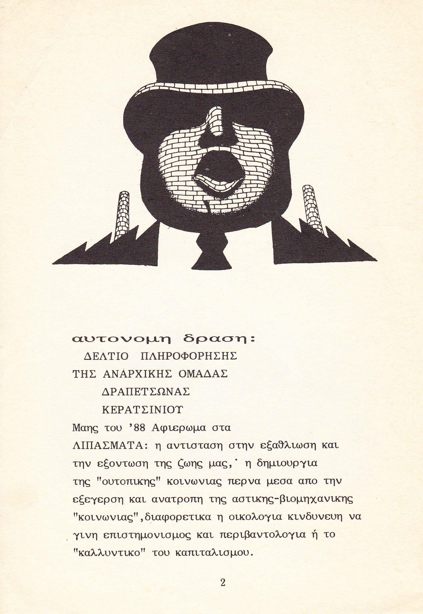 Η μπροσούρα αυτή με τίτλο “ η κοινωνία της μόλυνσης δεν καθαρίζεται… ΑΝΑΤΡΕΠΕΤΑΙ!!! ”, είναι μια από τις πρώτες οικολογικές μελέτες που έγιναν από αναρχική ομάδα, την Αναρχική Ομάδα Δραπετσώνας- Κερατσινίου το 1988 (στη οποία συμμετείχα εκείνη την περίοδο) και η πρώτη που έγινε σε τοπικό επίπεδο για θέματα περιβαλλοντικής μόλυνσης που μάστιζαν την περιοχή μας και επηρέαζαν ακόμη και το λεκανοπέδιο αττικής.