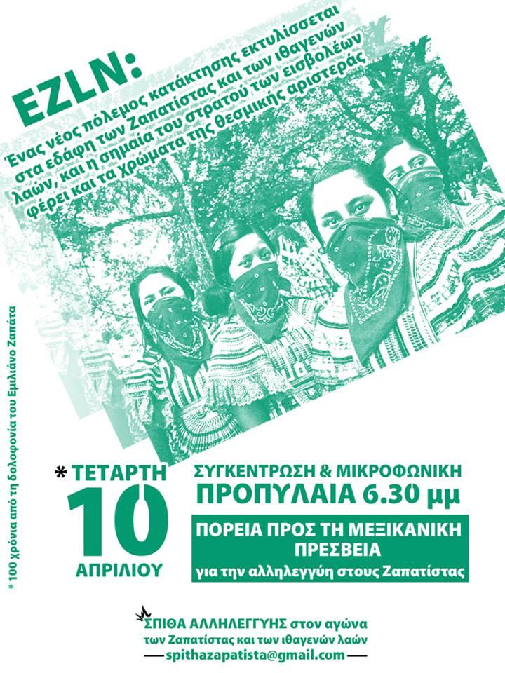 * Ως Αυτοοργανωμένη Ελευθεριακή Συνέλευση Paliacate Zapatista συμμετέχουμε και στηρίζουμε την συγκέντρωση στα Προπύλαια και την πορεία προς τη Μεξικανική Πρεσβεία στις 10 Απριλίου, που πραγματοποιείται στα πλαίσια της μεξικανικής και παγκόσμιας κινητοποίησης «Ο Zapata ζει, ο Samir ζει, ο αγώνας συνεχίζεται. 100 χρόνια από τη δολοφονία του Emiliano Zapata».
