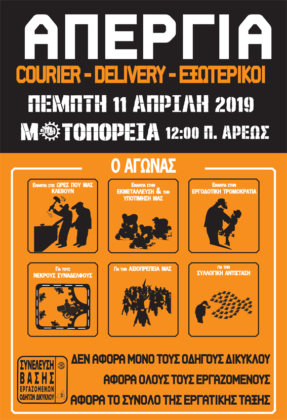 Συγκεκριμένα, η Συνέλευση Βάσης Εργαζομένων Οδηγών Δικύκλων καλεί σε δυναμικό «παρών» στην απεργία, καθώς και σε μοτοπορεία, όλους τους εργαζόμενους με μηχανάκια, προαναγγέλοντας συγκέντρωση την Πέμπτη στις 12:00, στο Πεδίον του Άρεως.
