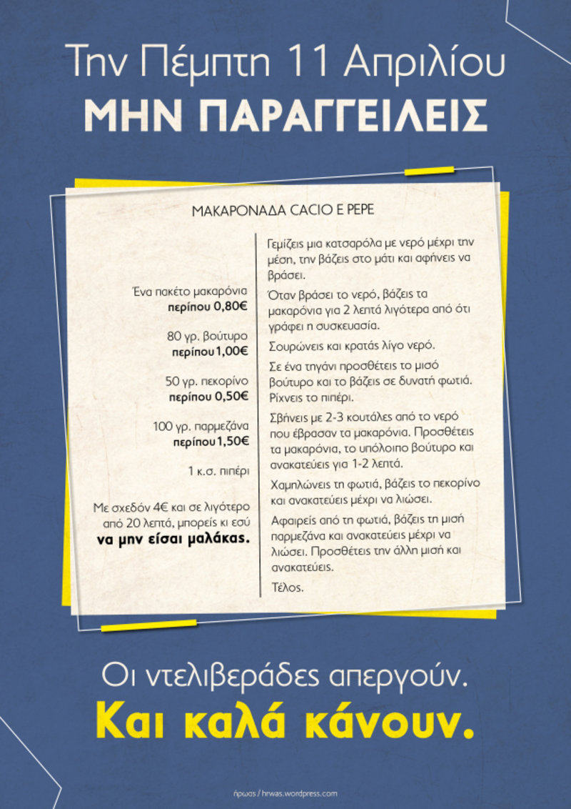 Σε μια ευφάνταστη αφίσα που διακινούν στα μέσα κοινωνικής δικτύωσης, οι ντελιβεράδες-κούριερ προτείνουν, μάλιστα, μια οικονομική συνταγή για να ικανοποιήσουν την… πείνα όσων ετοιμάζονταν να παραγγείλουν φαγητό.