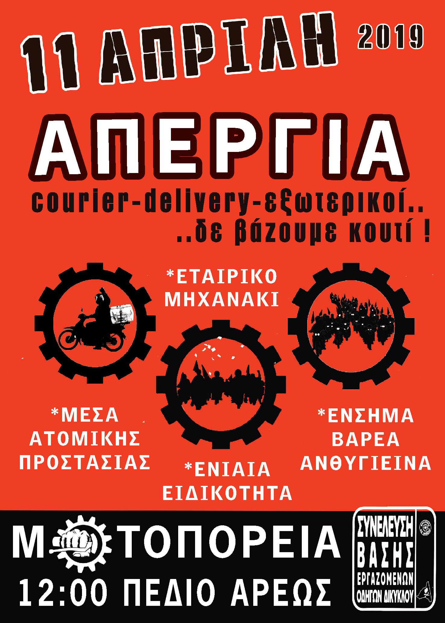 Από την πλευρά του, ο Βασίλης Κεφαλάς, μέλος της διοίκησης του Συνδικάτου Επισιτισμού-Τουρισμού Θεσσαλονίκης και μέλος της Επιτροπής Αγώνα Διανομέων Θεσσαλονίκης, δήλωσε στο ΑΠΕ-ΜΠΕ ότι η 11η Απριλίου είναι μία ημέρα πανελλαδικής δράσης των διανομέων με μοτοπορείες.