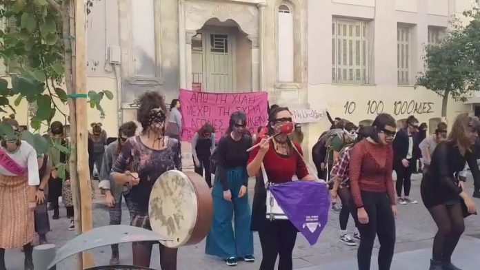 Γυναίκες με δεμένα τα μάτια τους συγκεντρώθηκαν μπροστά στο δικαστικό μέγαρο της πόλης και με τύμπανα που κρατούσαν το ρυθμό τραγούδησαν σε ελληνικούς στίχους και χόρεψαν τον ύμνο ενάντια στη βία κατά των γυναικών.