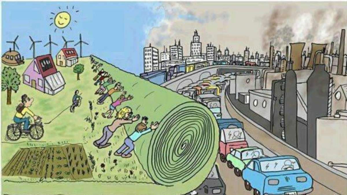 Ένας φιλικός προς το περιβάλλον μετασχηματισμός όλων των τομέων καθώς και ένας τρόπος ζωής που χαρακτηρίζεται από την επάρκεια, που ξεκίνησαν από τη δεκαετία του 2020, οδήγησαν σε πολύ χαμηλότερη κατανάλωση ενέργειας το 2050. Η εναπομείνουσα ζήτηση ενέργειας έχει εκπληρωθεί από ανανεώσιμες-ήπιες πηγές ενέργειας(όχι μόνο ηλιακής, αιολικής, υδατοπτώσεων, αλλά και υδρογόνου ή από συστήματα δέσμευσης της ελεύθερης ενέργειας) εδώ και δέκα χρόνια. Οι ενεργειακές εγκαταστάσεις δεν ανήκουν σε ιδιωτικές εταιρείες, αλλά είναι δημόσιες και διαχειρίζονται δημοκρατικά από κοινότητες, δήμους και περιφέρειες ή οργανωμένες ενεργειακές κοινότητες. Σε ορισμένες περιοχές και περιφέρειες, τα παλαιά δίκτυα εφοδιασμού χρησιμοποιούνται για τη διανομή ηλεκτρισμού και θερμότητας. Άλλες περιφέρειες βασίζονται στην ενεργειακή αυτάρκεια νοικοκυριών, κοινοτήτων, συνοικιών και δήμων. Η μέχρι πριν πολλά χρόνια πολιτική για το κλίμα, που βασιζόταν στα κράτη και χαρακτηριζόταν από ανταγωνιστική σκέψη, αποτελεί πια μακρινό παρελθόν. Αντ ‘ αυτού, υπάρχει ένας δημοκρατικός παγκόσμιος οργανισμός, που δημιουργήθηκε από την παγκόσμια Κοινότητα των Κοινοτήτων ως πάροχος υπηρεσιών για τα μικρότερα επίπεδα και που υποβάλλει προτάσεις για τη διανομή πρώτων υλών και πόρων και τη συμμόρφωση με τους κλιματικούς στόχους.