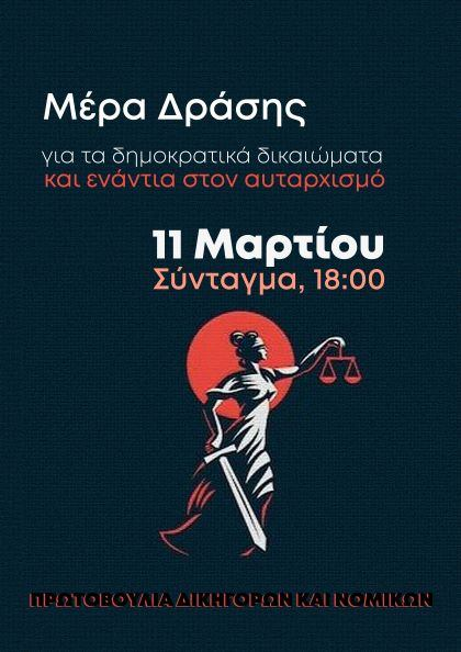 Σε ημέρα δράσης για τα δημοκρατική δικαιώματα και ενάντια στον αυταρχισμό καλεί η Πρωτοβουλία Νομικών και Δικηγόρων, η Πρωτοβουλία καλλιτεχνών, αλλά και κόμματα και οργανώσεις, με κινητοποίηση στις 18:00 το απόγευμα την Πέμπτη, στο Σύνταγμα. «Απευθυνόμαστε στον νομικό κόσμο, τους φοιτητικούς συλλόγους, τους πανεπιστημιακούς που κινητοποιήθηκαν ενάντια στην αστυνομία στα πανεπιστήμια, τις επιτροπές δημοκρατικών δικαιωμάτων, τις πρωτοβουλίες καλλιτεχνών, τα εργατικά σωματεία, όλες τις οργανώσεις, τους φορείς και τις συλλογικότητες που αγωνιούν για την διαφαινόμενη απειλή κατά της δημοκρατίας» τονίζει η Πρωτοβουλία Δικηγόρων.