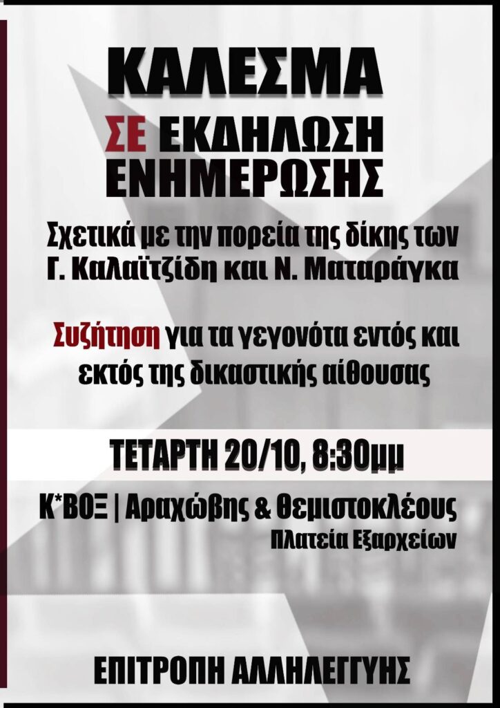 Η Επιτροπή Αλληλεγγύης στους Γ. Καλαϊτζίδη και Ν. Ματαράγκα σας καλεί όλες και όλους την Τετάρτη 20/10 στις 8:30μμ στο Κοινωνικό Κέντρο ΒΟΞ, σε μια ανοιχτή συζήτηση ενημέρωσης σχετικά με την πορεία της δίκης αλλά και προκειμένου να οργανωθούν τα επόμενα βήματα του κινήματος αλληλεγγύης στους δύο αγωνιστές.