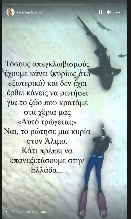«Τόσους απεγκλωβισμούς έχουμε κάνει (κυρίως στο εξωτερικό) και δεν έχει έρθει κανείς να ρωτήσει για το ζώο που κρατάμε στα χέρια μας «Αυτό τρώγεται;». Ναι, το ρώτησε μια κυρία στον Άλιμο. Κάτι πρέπει να επανεξετάσουμε στην Ελλάδα…», έγραψε χαρακτηριστικά, συνοδεύοντας το μήνυμά της με μια φωτογραφία.