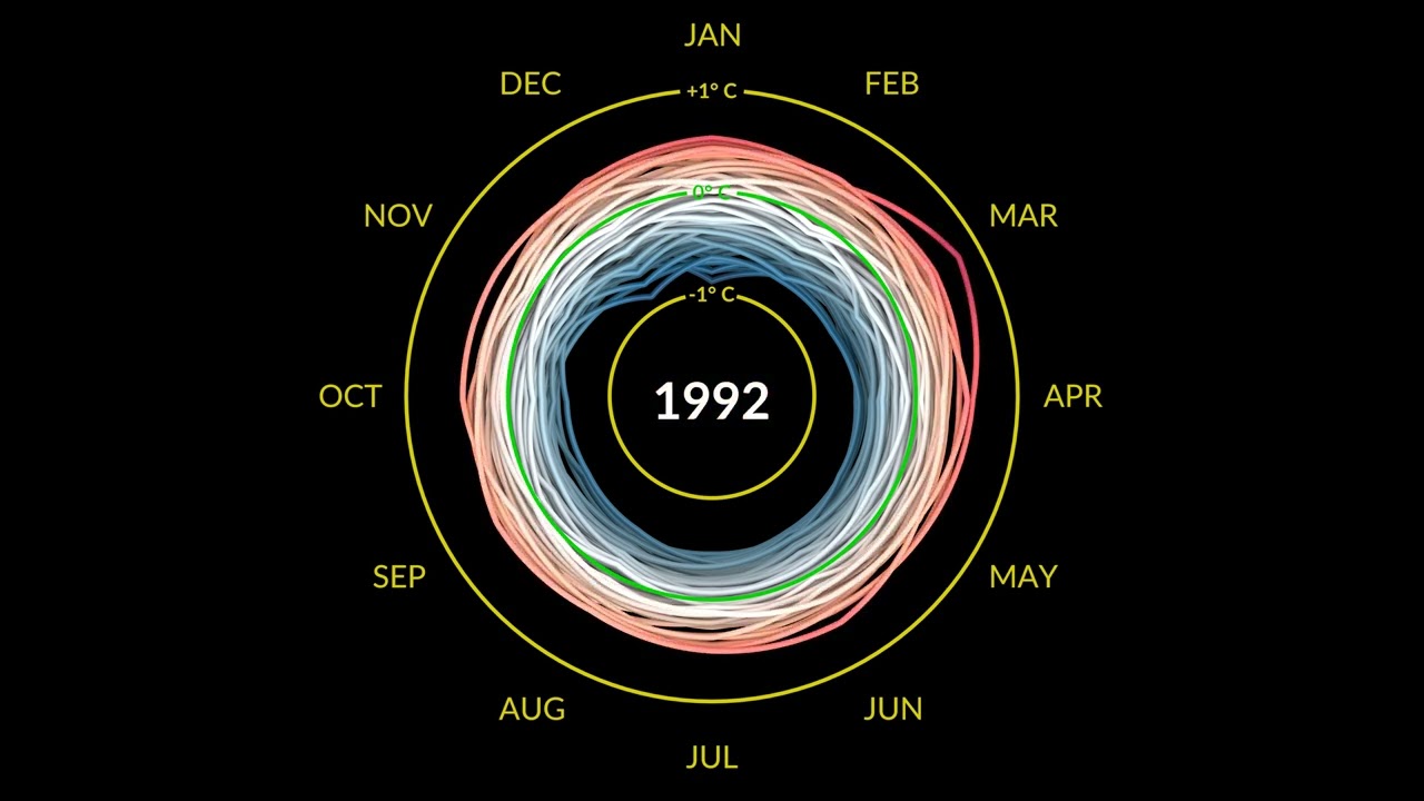 Αυτή η οπτικοποίηση δείχνει μηνιαίες ανωμαλίες της παγκόσμιας θερμοκρασίας (μεταβολές από έναν μέσο όρο) μεταξύ των ετών 1880 και 2021. Τα λευκά και τα μπλε υποδηλώνουν ψυχρότερες θερμοκρασίες, ενώ τα πορτοκαλί και τα κόκκινα δείχνουν θερμότερες θερμοκρασίες. Όπως μπορείτε να δείτε, οι παγκόσμιες θερμοκρασίες έχουν αυξηθεί κυρίως από ανθρώπινες δραστηριότητες καθώς προχωρά ο χρόνος.