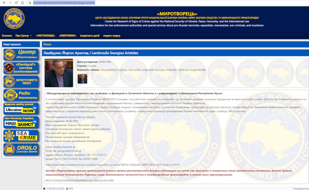 «… Στοχοποίηση Ελλήνων κομμουνιστών σε «μαύρη λίστα» στο διαδίκτυο! «Μακρύ χέρι» της ουκρανικής κυβέρνησης ο ιστότοπος που δημοσιεύει προσωπικά δεδομένα χιλιάδων, ανάμεσά τους και τριών στελεχών του ΚΚΕ Θύματα δολοφονίας έχουν πέσει στο παρελθόν άνθρωποι που βρίσκονταν στη συγκεκριμένη «μαύρη λίστα»…» του myrotvorets.center