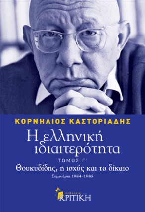 *] Ο τρίτος τόμος της «Ελληνικής ιδιαιτερότητας» αφιερώνεται στο έργο του Θουκυδίδη. Ο Κορνήλιος Καστοριάδης επιχειρεί μια πρωτότυπη ανάλυση του «Επιταφίου», που αποδίδεται από τον αρχαίο ιστορικό στον Περικλή, για να δείξει σε ποιο βαθμό η μεγάλη αθηναϊκή δημιουργία του 5ου αιώνα είχε συνείδηση του εαυτού της.