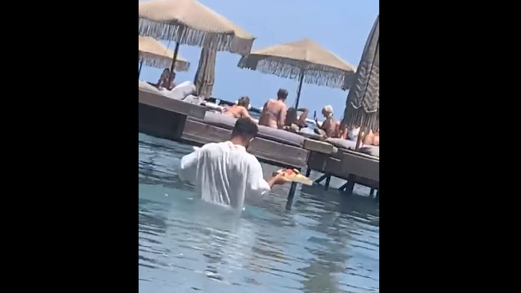 Ρόδος 2023. Η φώτο δείχνει έναν εργαζόμενο σερβιτόρο να σερβίρει τουρίστες ξαπλωμένους σε ξαπλώστρες μέσα στην θάλασσα. Ο σερβιτόρος -που εικονίζεται – είπε πως:«δεν έχει κανένα πρόβλημα με αυτού του είδους το σερβίρισμα που του αποφέρει φιλοδώρημα το οποίο φθάνει ακόμη και τα 200 ευρώ».